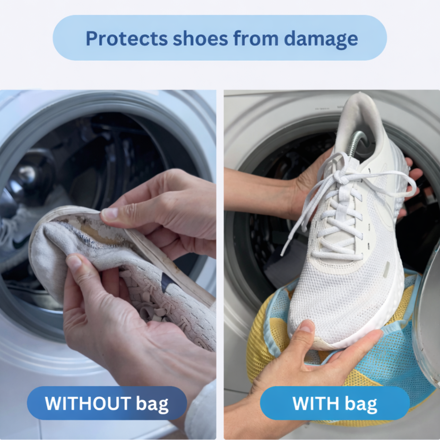 I was worried the washing machine would ruin the shape of my sneakers, but this bag actually keeps them protected. I washed two pairs already and they came out clean with no bending or damage. Way better than throwing them directly in the washer.